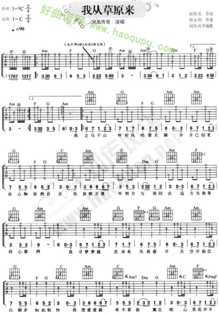 歌曲《我从草原来》有凤凰传奇演唱,这首歌曲历经三年打造,将草原般的豪情以及东方文化的古韵表现的淋漓尽致。此曲由赵铁志填词,郭永利作曲。今天为大家分享一下这首歌曲的吉他谱!