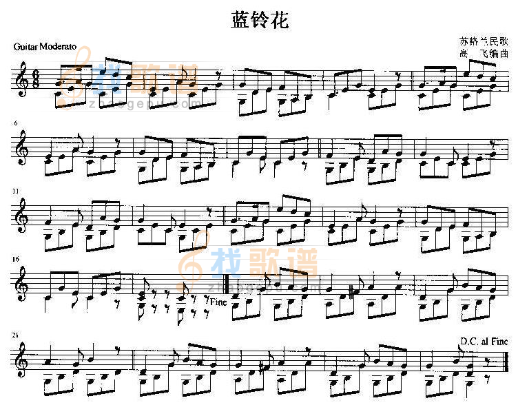 :苏格兰蓝铃花 吉他独奏谱(五线谱)吉他谱该歌谱演奏者为高飞编曲 ,歌曲名称为苏格兰蓝铃花,歌谱类型为。又译为结他或六弦琴。是一种弹拨乐器,通常有六条弦,形状与提琴相似。吉他在流行音乐、摇滚音乐、蓝调、民歌、佛朗明哥中,常被视为主要乐器。而在古典音乐的领域里,吉他常以独奏或二重奏的型式演出;当然,室内乐和管弦乐中,吉他亦扮演着相当程度的陪衬角色。古典吉他与小提琴、钢琴并列为世界著名三大乐器。