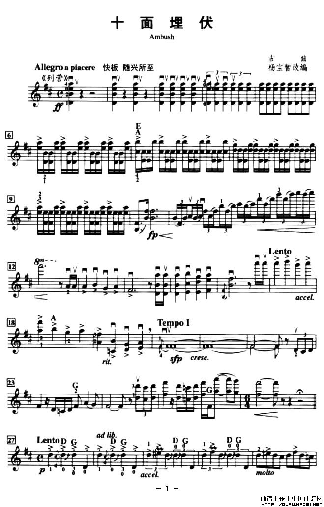 十面埋伏小提琴谱该歌谱演奏者为杨宝智,歌曲名称为十面埋伏,歌谱类型为小提琴谱。十面埋伏是一首汉族琵琶大曲,同时也是中国十大古曲之一,其演奏为独奏,乐曲激烈,震撼人心,清楚地表现出了当时项羽被大军包围时走投无路的场景。为上乘的艺术佳作。