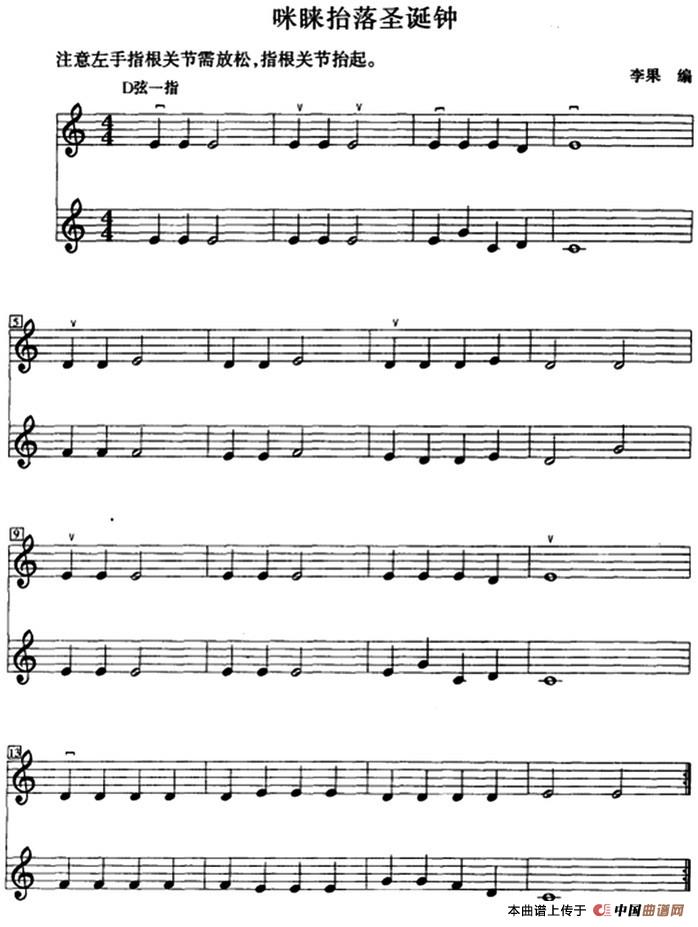 咪莱抬落圣诞钟小提琴谱该歌谱演奏者为未知,歌曲名称为咪莱抬落圣诞钟,歌谱类型为小提琴谱。小提琴(意大利文:Il violino )是一种弦乐器。总共有四根弦。靠弦和弓摩擦发出声音。小提琴琴身(共鸣箱)长约35.5厘米,由具有弧度的面板、背板和侧板粘合而成。面板常用云杉制作,质地较软;背板和侧板用枫木,红木,质地较硬。琴头、琴颈用整条枫木,指板用乌木。