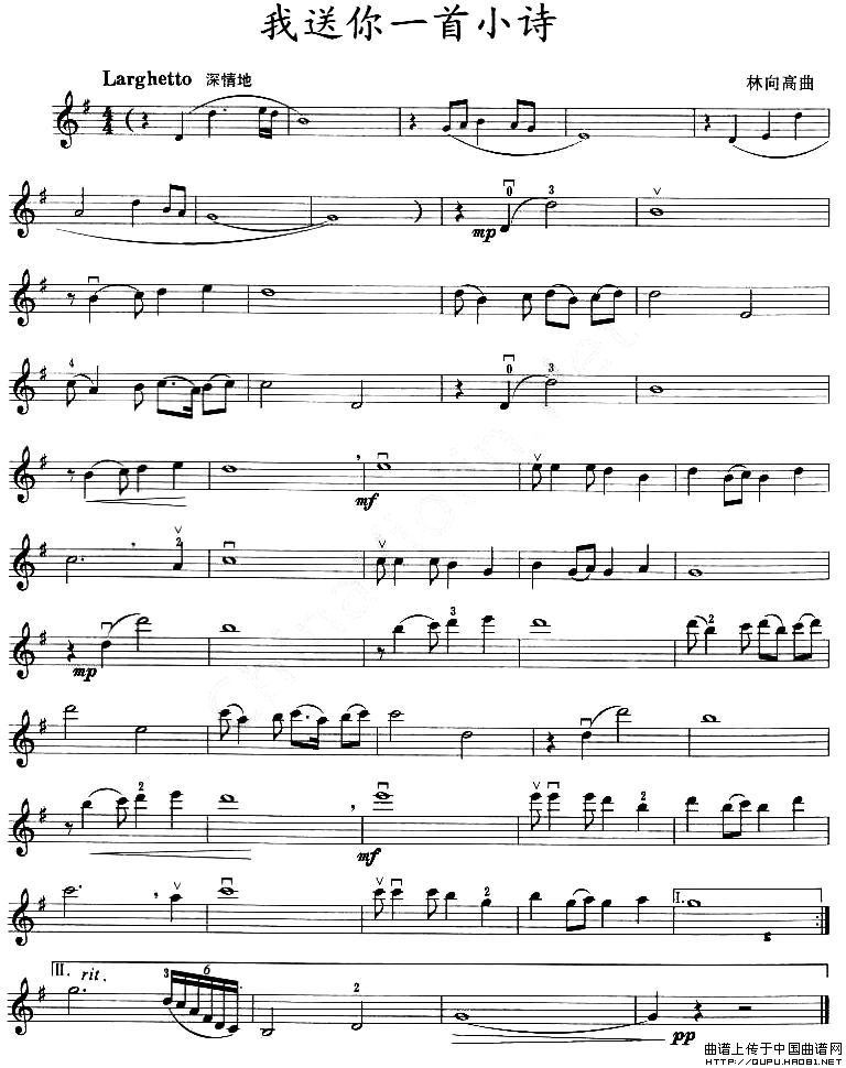 我送你一首小诗小提琴谱该歌谱演奏者为林向高,歌曲名称为我送你一首小诗,歌谱类型为小提琴谱。《我送你一首小诗》是内地朱逢博于1980年在内地唱响深受年轻人欢迎的一首台湾校园歌曲,并收录在唱片《我的情诗》中。
