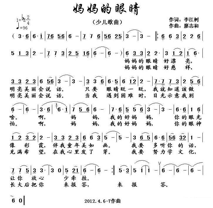 妈妈的眼睛 妈妈的眼睛(李江树词 廖志和曲)简谱-儿歌曲谱 曲谱 歌谱下载