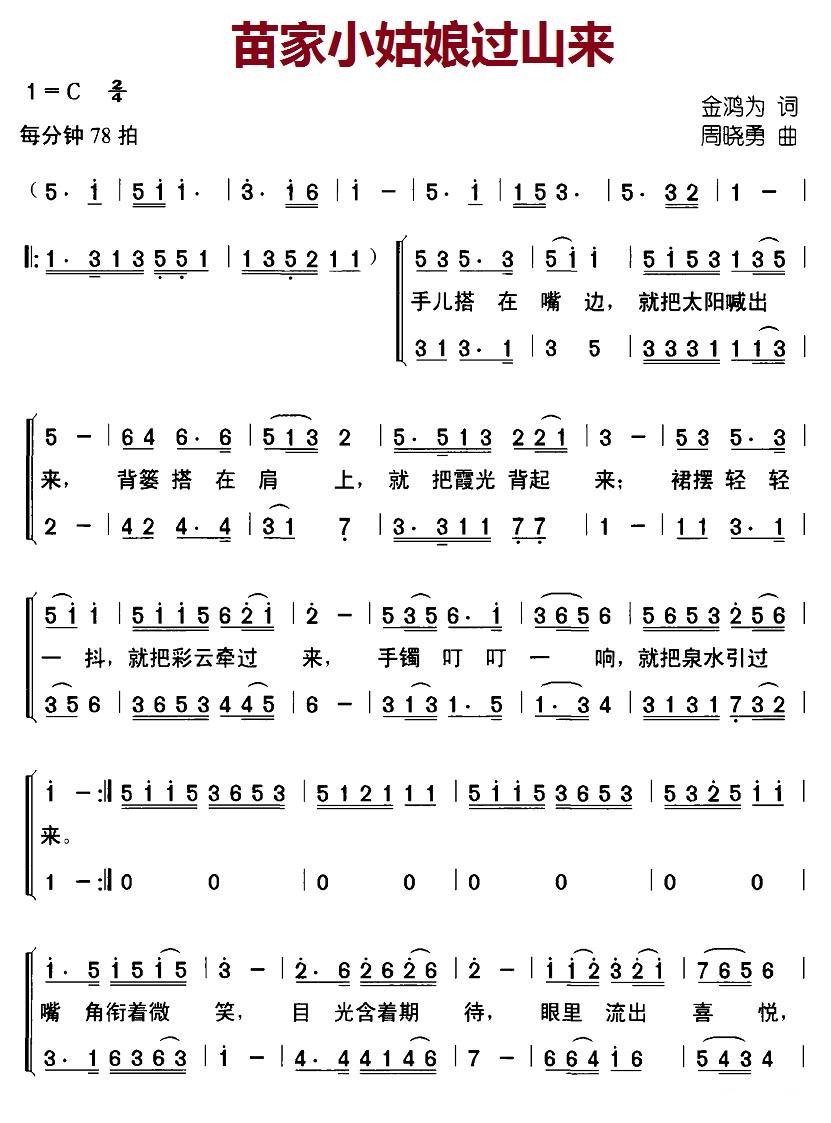 苗家小姑娘过山来 苗家小姑娘过山来(金鸿为词 周晓勇曲)简谱-儿歌曲谱 曲谱 歌谱下载