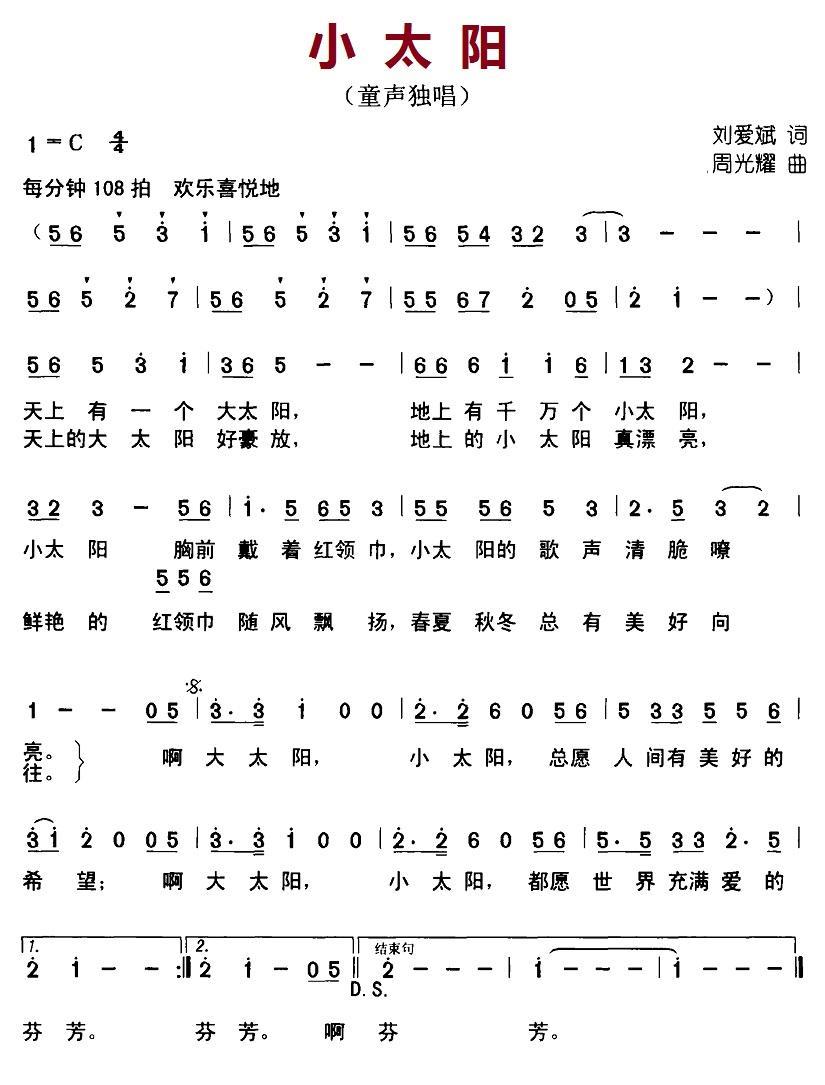 小太阳 小太阳(刘爱斌词 周光耀曲)简谱-儿歌曲谱 曲谱 歌谱下载