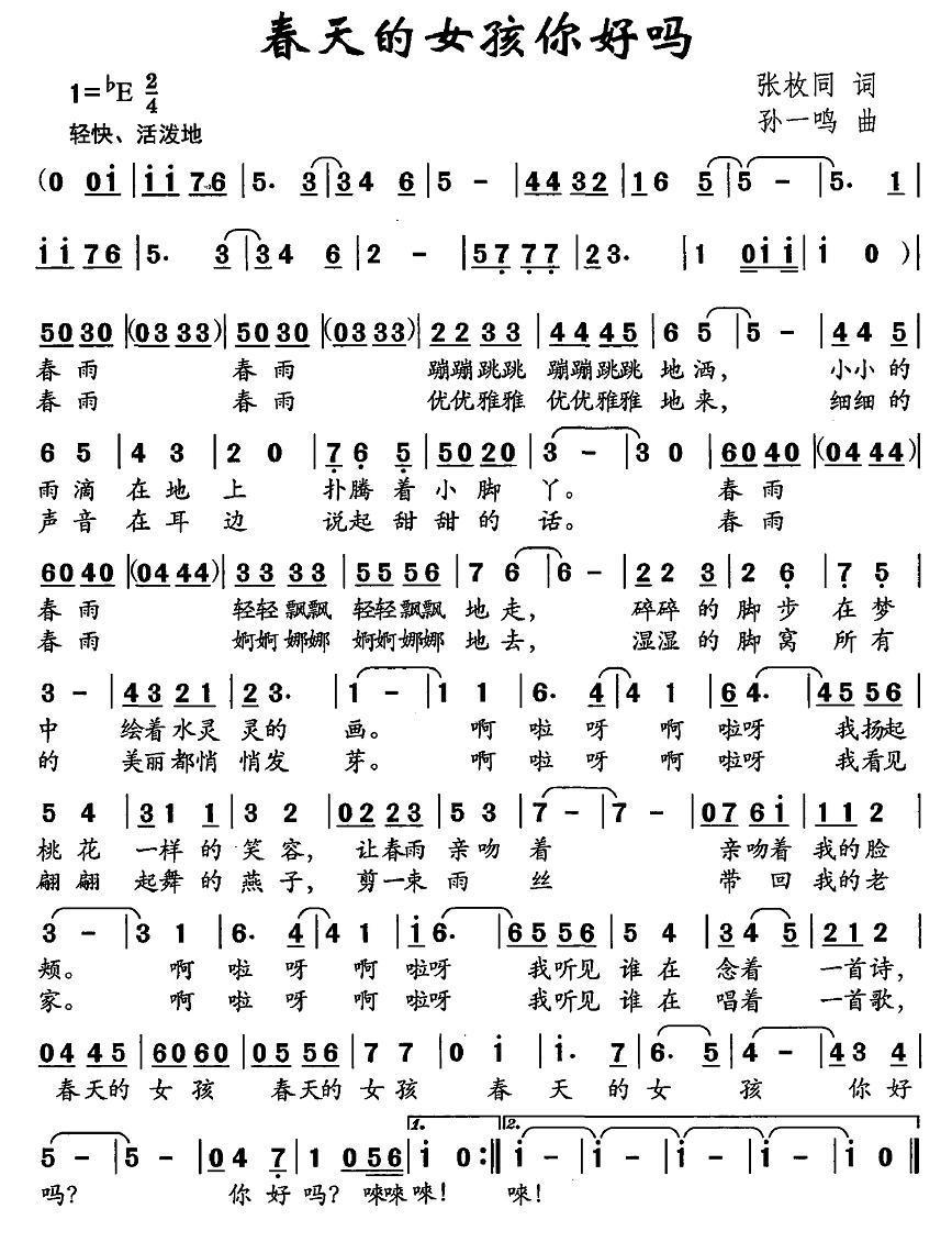 春天的女孩你好吗 春天的女孩你好吗(孙一鸣曲 张枚同词)简谱-儿歌曲谱 曲谱 歌谱下载