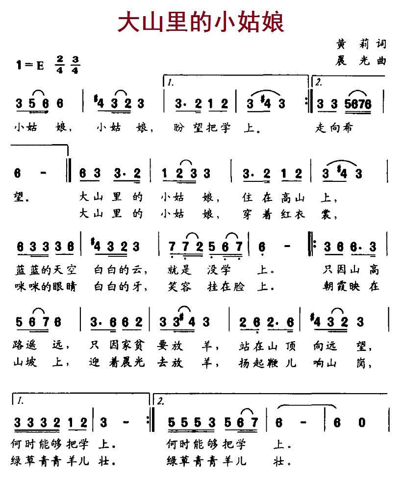 大山里的小姑娘 大山里的小姑娘(黄莉词 晨光曲)简谱-儿歌曲谱 曲谱 歌谱下载