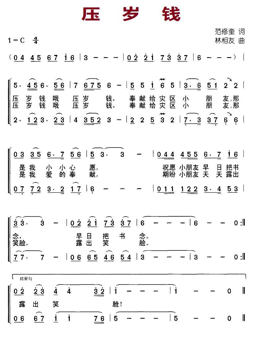 压岁钱 压岁钱(范修奎词 林相友曲)简谱-儿歌曲谱 曲谱 歌谱下载