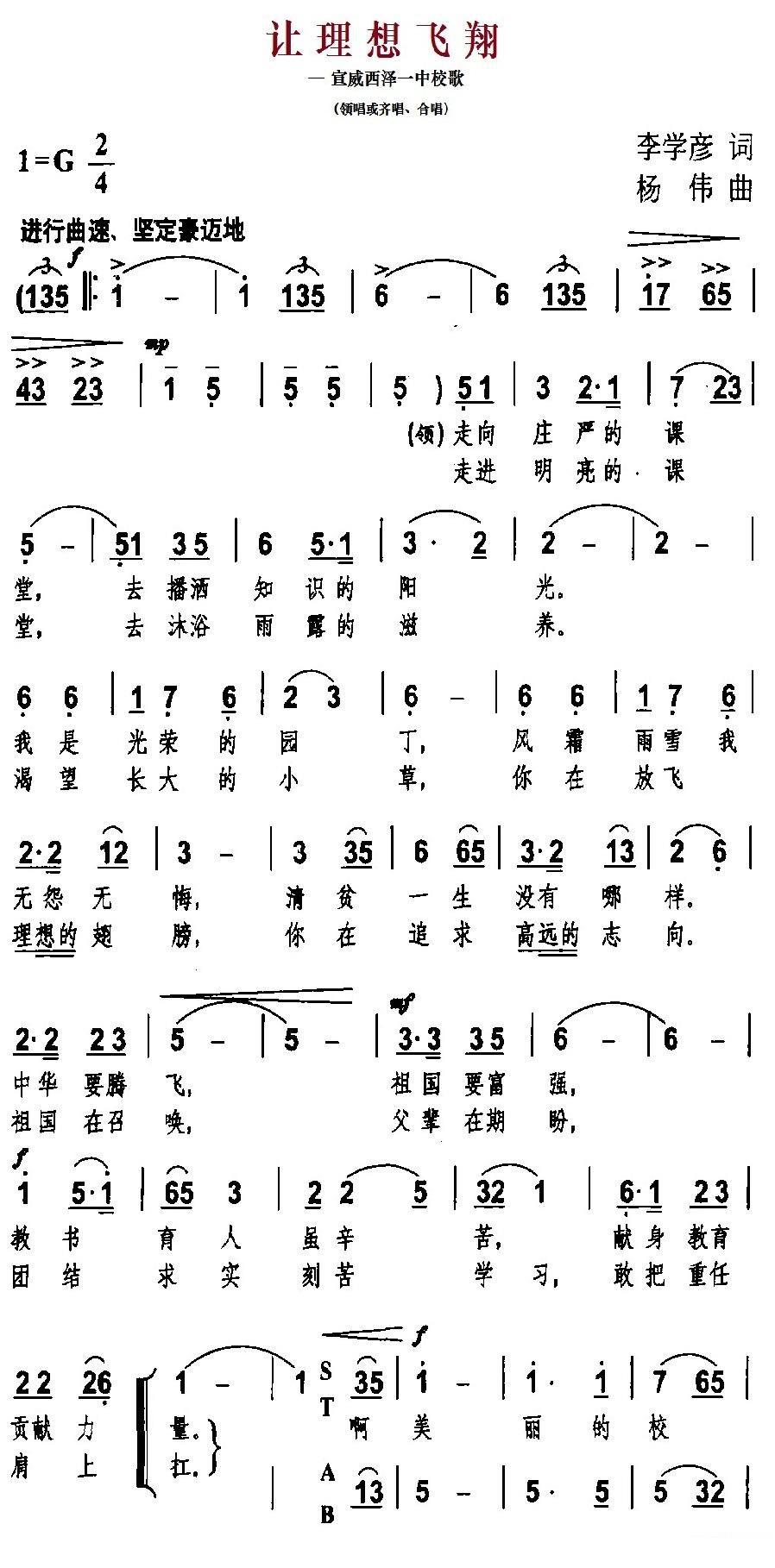 让理想飞翔 宣威西泽一中校歌:让理想飞翔简谱-儿歌曲谱 曲谱 歌谱下载