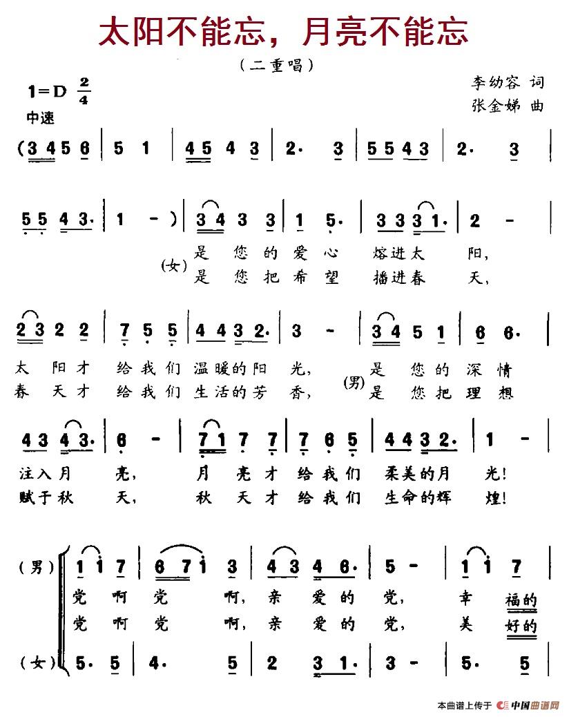 太阳不能忘月亮不能忘 太阳不能忘,月亮不能忘(李幼容词 张金娣曲)简谱-儿歌曲谱 曲谱 歌谱下载