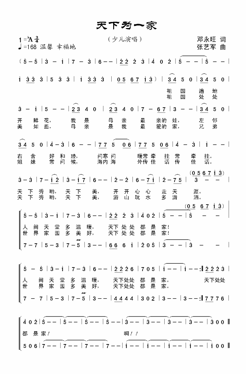 天下为一家 天下为一家(张艺军曲 邓永旺词)简谱-儿歌曲谱 曲谱 歌谱下载