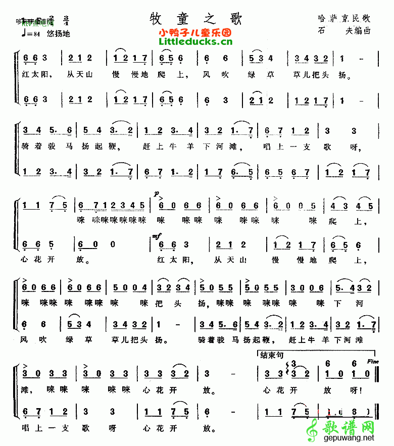 儿歌牧童之歌歌词:红太阳从天上,慢慢地爬上, 风吹绿草草儿把头扬, 骑上骏马扬起鞭, 赶上牛羊下河滩, 唱上一首歌呀心花开放。 红太阳从天上,慢慢地爬上, 风吹绿草草儿把头扬, 骑上骏马扬起鞭, 赶上牛羊下河滩, 唱上一首歌呀心花开放. 红太阳从天上,慢慢地爬上, 风吹绿草草儿把头扬, 骑上骏马扬起鞭, 赶上牛羊下河滩, 唱上一首歌呀心花开放.