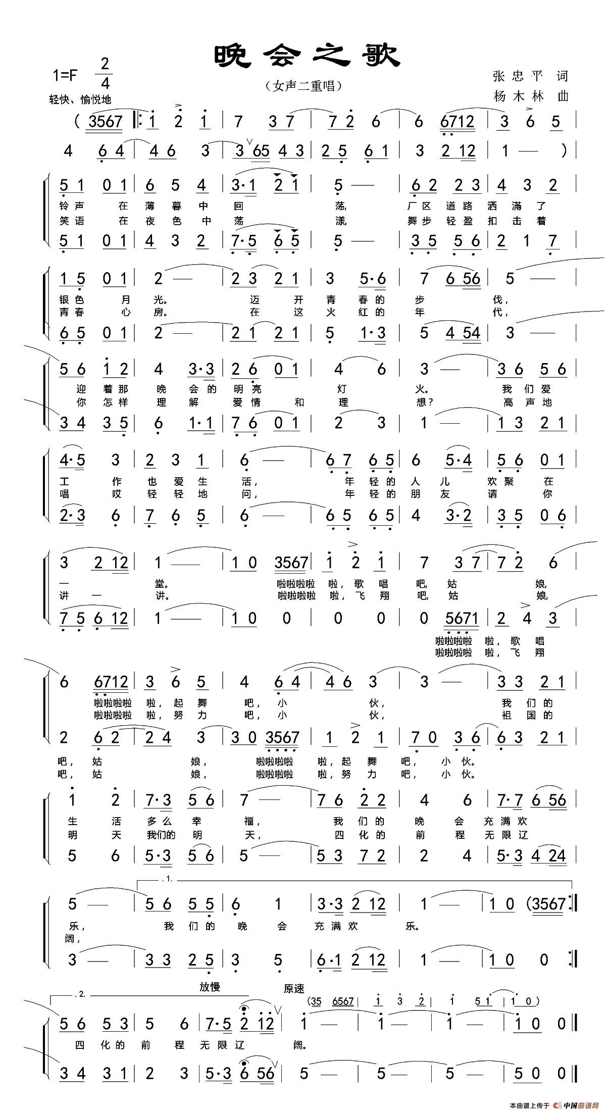 晚会之歌(女声二重唱)合唱谱该歌谱演奏者为杨木林 ,歌曲名称为晚会之歌,歌谱类型为合唱谱。集体演唱多声部声乐作品的艺术门类,常有指挥,可有伴奏或无伴奏。它要求单一声部音的高度统一,要求声部之间旋律的和谐,是普及性最强、参与面最广的音乐演出形式之一。人声作为合唱艺术的表现工具,有着其独特的优越性,能够最直接地表达音乐作品中的思想情感,激发听众的情感共鸣。声部的数量没有规定,一般有四个声部。多为男高音区,男中低音区,女高音区,女中低音区。