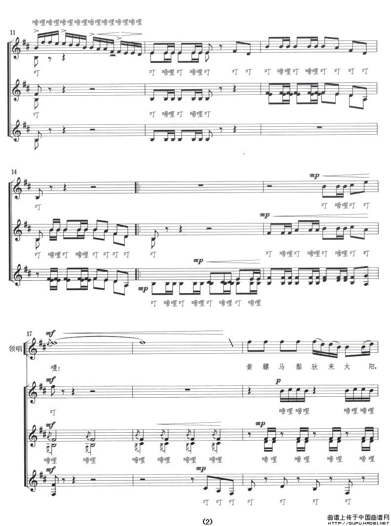 八骏赞(五线谱)合唱谱该歌谱演奏者为合唱,歌曲名称为八骏赞(五线谱),歌谱类型为合唱谱。合唱(hé chàng)chorus指集体演唱多声部声乐作品的艺术门类,常有指挥,可有伴奏或无伴奏。它要求单一声部音的高度统一,要求声部之间旋律的和谐,是普及性最强、参与面最广的音乐演出形式之一。人声作为合唱艺术的表现工具,有着其独特的优越性,能够最直接地表达音乐作品中的思想情感,激发听众的情感共鸣。声部的数量没有规定,一般有四个声部。多为男高音区,男中低音区,女高音区,女中低音区。