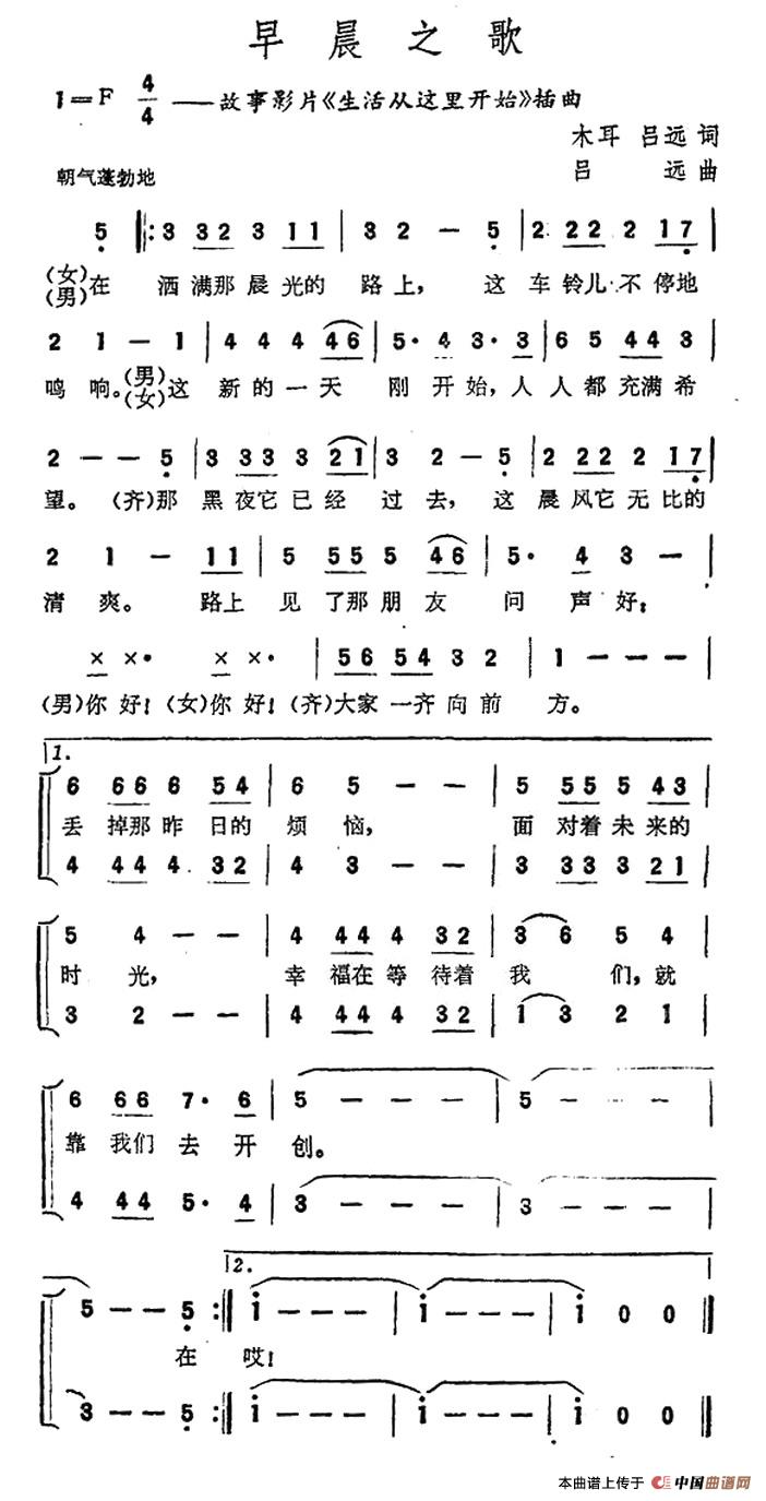 早晨之歌(电影《生活从这里开始》插曲)合唱谱