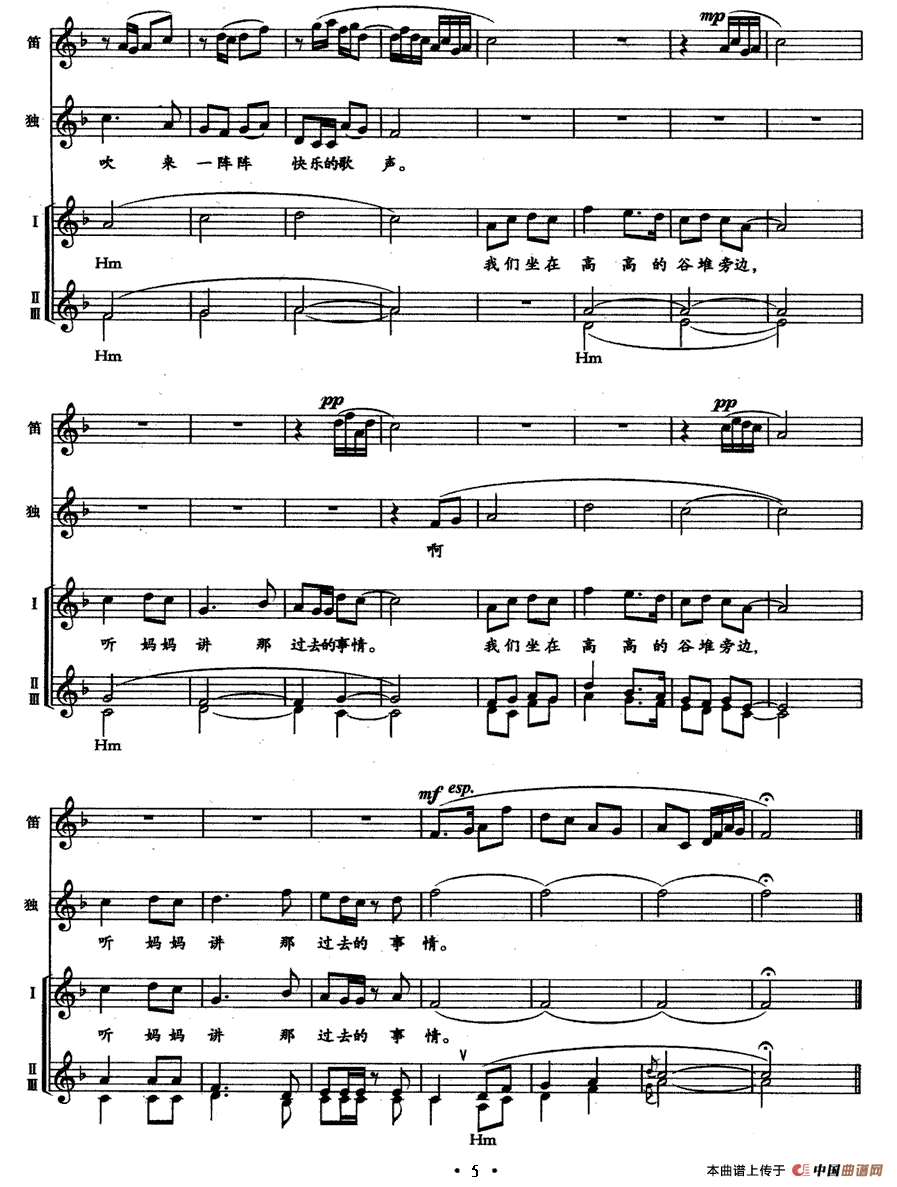 听妈妈讲那过去的事情(童声合唱、笛子助奏)合唱谱
