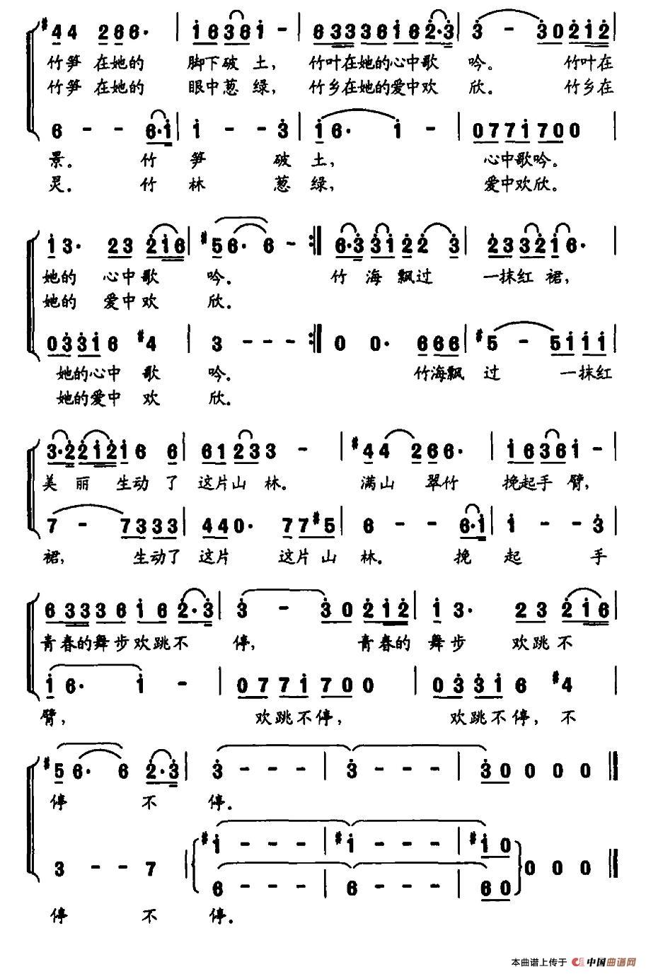 竹海飘来一抹红裙合唱谱该歌谱演奏者为潘振新,歌曲名称为竹海飘来一抹红裙,歌谱类型为合唱谱。集体演唱多声部声乐作品的艺术门类,常有指挥,可有伴奏或无伴奏。它要求单一声部音的高度统一,要求声部之间旋律的和谐,是普及性最强、参与面最广的音乐演出形式之一。人声作为合唱艺术的表现工具,有着其独特的优越性,能够最直接地表达音乐作品中的思想情感,激发听众的情感共鸣。声部的数量没有规定,一般有四个声部。多为男高音区,男中低音区,女高音区,女中低音区。
