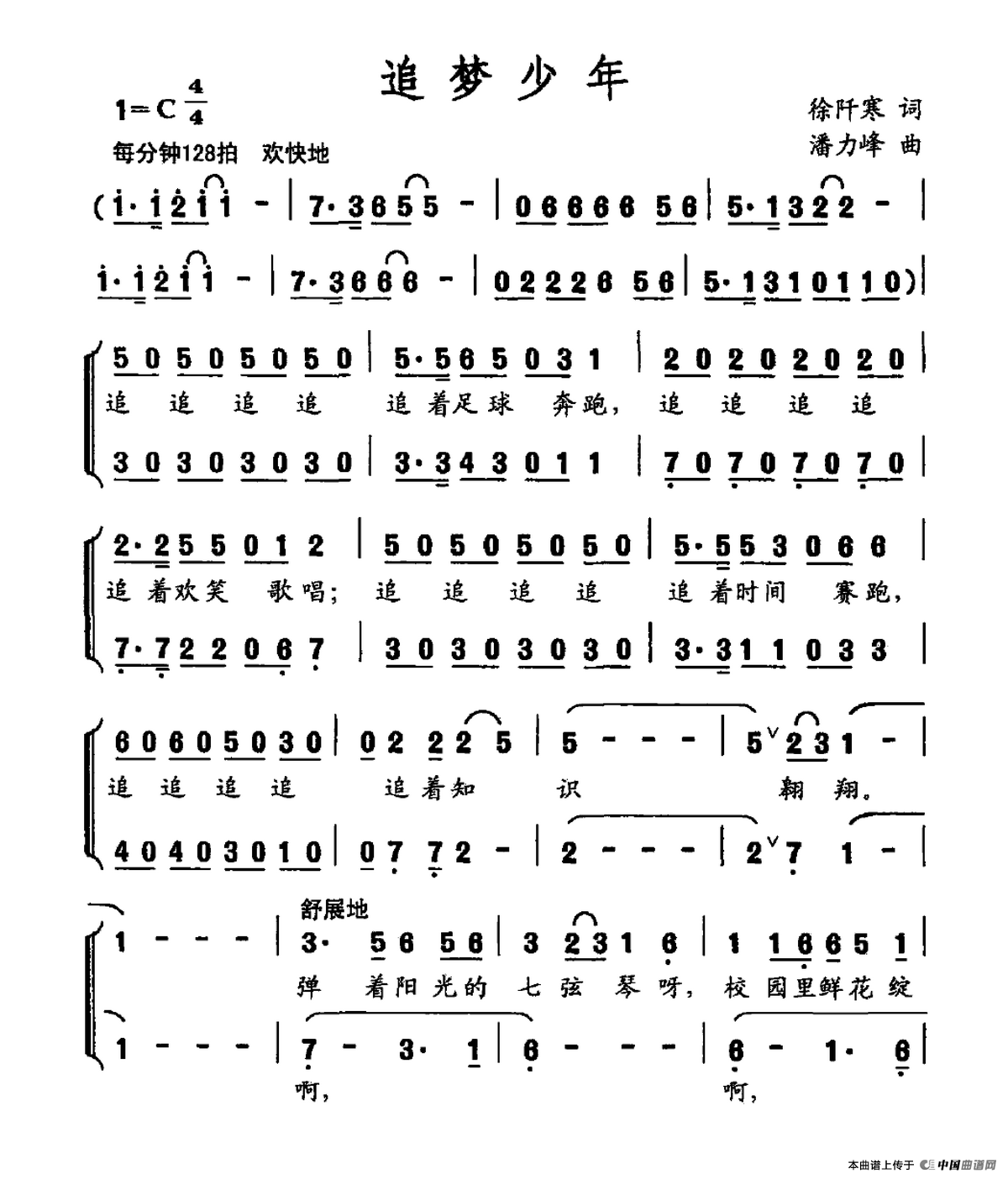 追梦少年合唱谱该歌谱演奏者为潘力峰,歌曲名称为追梦少年,歌谱类型为合唱谱。集体演唱多声部声乐作品的艺术门类,常有指挥,可有伴奏或无伴奏。它要求单一声部音的高度统一,要求声部之间旋律的和谐,是普及性最强、参与面最广的音乐演出形式之一。人声作为合唱艺术的表现工具,有着其独特的优越性,能够最直接地表达音乐作品中的思想情感,激发听众的情感共鸣。声部的数量没有规定,一般有四个声部。多为男高音区,男中低音区,女高音区,女中低音区。