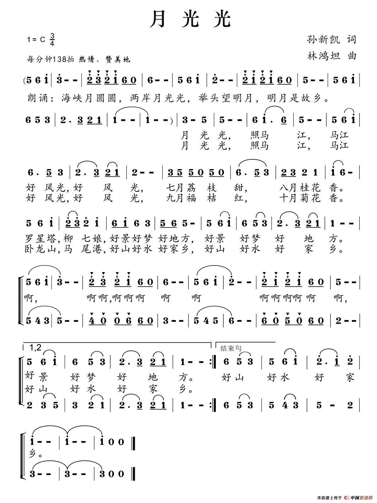 月光光(女声小组唱)合唱谱该歌谱演奏者为林鸿坦,歌曲名称为月光光,歌谱类型为合唱谱。《月光光》是一首客家地区家喻户晓的客家童谣,如今许多音乐人在此童谣基础上,创作出了客家流行歌曲。