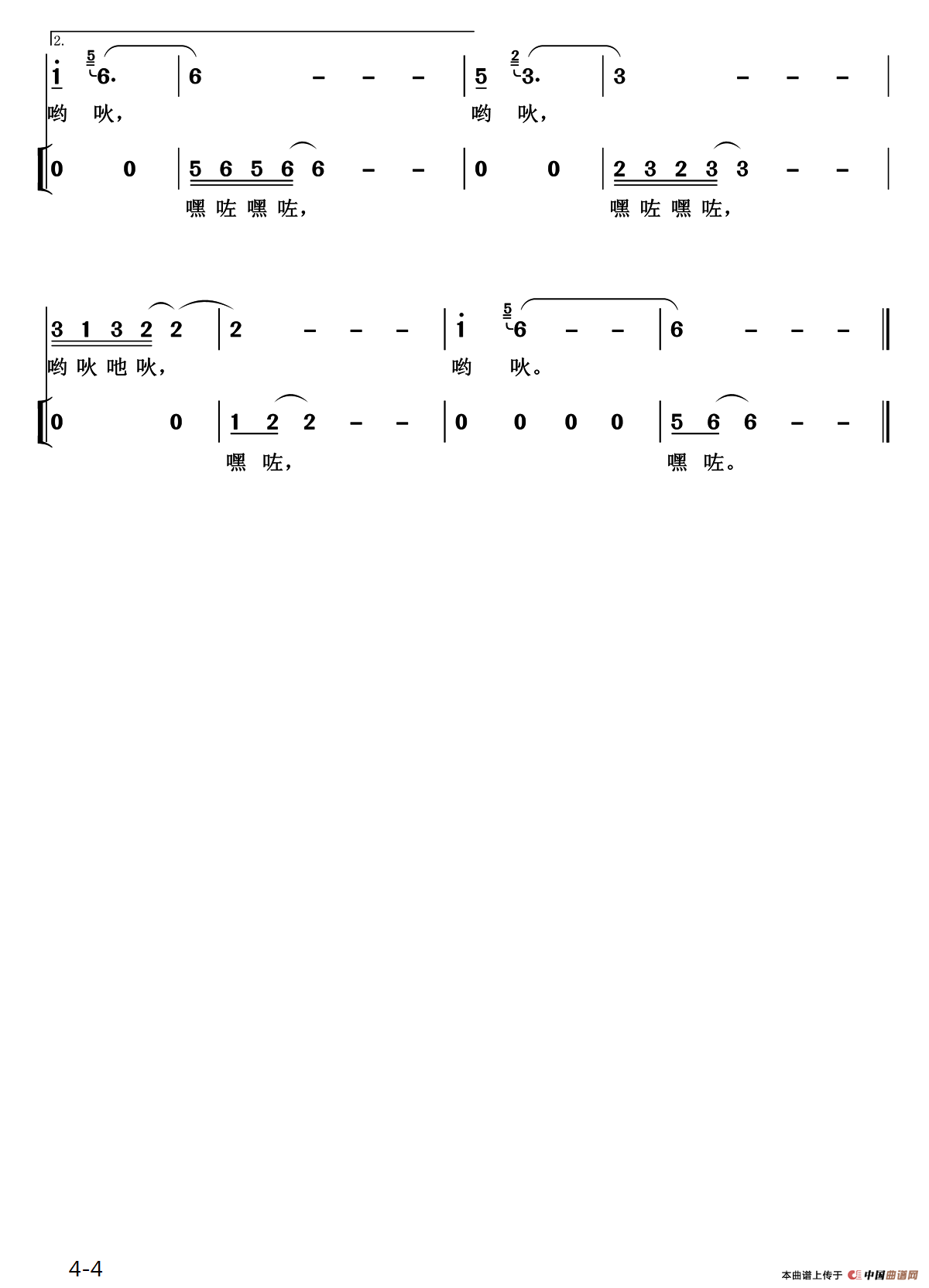 由女高音声部、女低音声部、男高音声部和男低音声部四个基本声部组成的合唱为混声合唱。每个基本声部可分为第一、第二两个分声部。