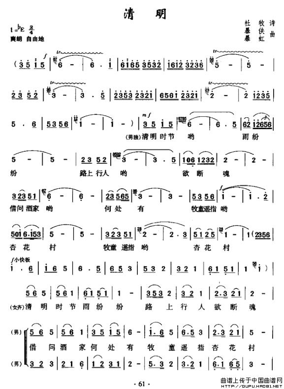 :清明([唐]杜牧词 暴虹曲)合唱谱该歌谱演奏者为暴虹,歌曲名称为清明,歌谱类型为。《清明》是唐代文学家杜牧的诗作。此诗写清明春雨中所见,色彩清淡,心境凄冷,历来广为传诵。第一句交代情景、环境、气氛;第二句写出了人物,显示了人物的凄迷纷乱的心境;第三句提出了如何摆脱这种心境的办法;第四句写答话带行动,是整篇的精彩所在。全诗运用由低而高、逐步上升、高潮顶点放在最后的手法,余韵邈然,耐人寻味。月色清明舞婆娑(京剧《霸王别姬》选段)合唱谱