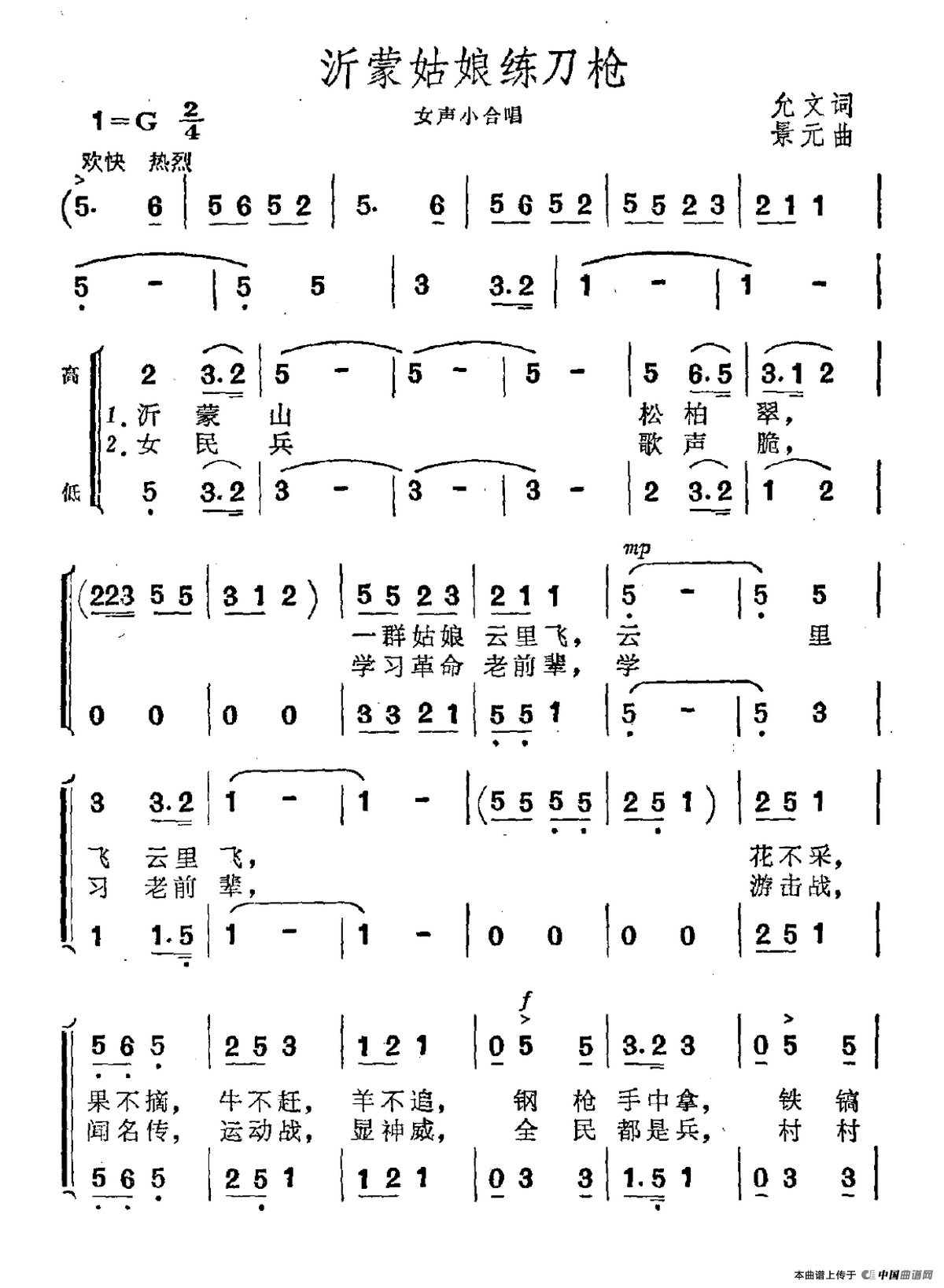 沂蒙姑娘练刀枪(女声小合唱)合唱谱