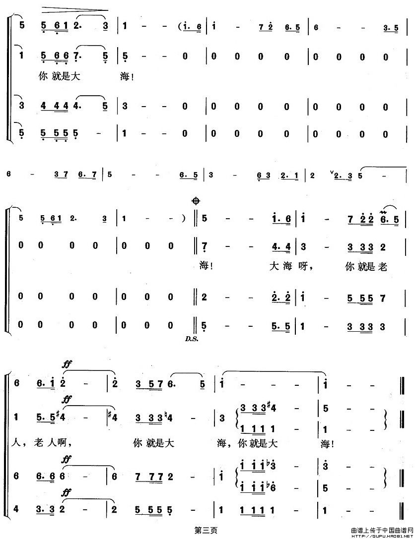 老人和大海(曾腾芳词 戴于吾曲)合唱谱该歌谱演奏者为戴于吾,歌曲名称为老人和大海,歌谱类型为合唱谱。指集体演唱多声部声乐作品的艺术门类,常有指挥,可有伴奏或无伴奏。它要求单一声部音的高度统一,要求声部之间旋律的和谐,是普及性最强、参与面最广的音乐演出形式之一。人声作为合唱艺术的表现工具,有着其独特的优越性,能够最直接地表达音乐作品中的思想情感,激发听众的情感共鸣。声部的数量没有规定,一般有四个声部。多为男高音区,男中低音区,女高音区,女中低音区。