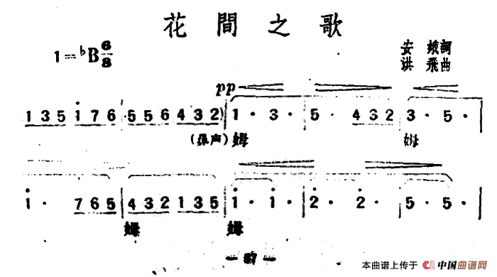 花间之歌合唱谱该歌谱演奏者为洪飞,歌曲名称为花间之歌,歌谱类型为合唱谱。集体演唱多声部声乐作品的艺术门类,常有指挥,可有伴奏或无伴奏。它要求单一声部音的高度统一,要求声部之间旋律的和谐,是普及性最强、参与面最广的音乐演出形式之一。人声作为合唱艺术的表现工具,有着其独特的优越性,能够最直接地表达音乐作品中的思想情感,激发听众的情感共鸣。声部的数量没有规定,一般有四个声部。多为男高音区,男中低音区,女高音区,女中低音区