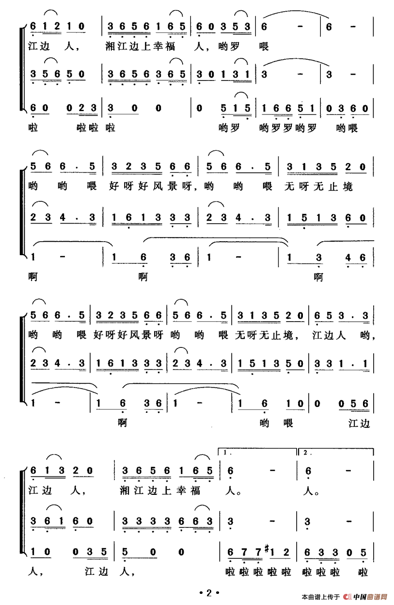 江边人(女声小合唱)合唱谱该歌谱演奏者为廖卫华,歌曲名称为江边人,歌谱类型为合唱谱。指集体演唱多声部声乐作品的艺术门类,常有指挥,可有伴奏或无伴奏。它要求单一声部音的高度统一,要求声部之间旋律的和谐,是普及性最强、参与面最广的音乐演出形式之一。人声作为合唱艺术的表现工具,有着其独特的优越性,能够最直接地表达音乐作品中的思想情感,激发听众的情感共鸣。声部的数量没有规定,一般有四个声部。多为男高音区,男中低音区,女高音区,女中低音区。