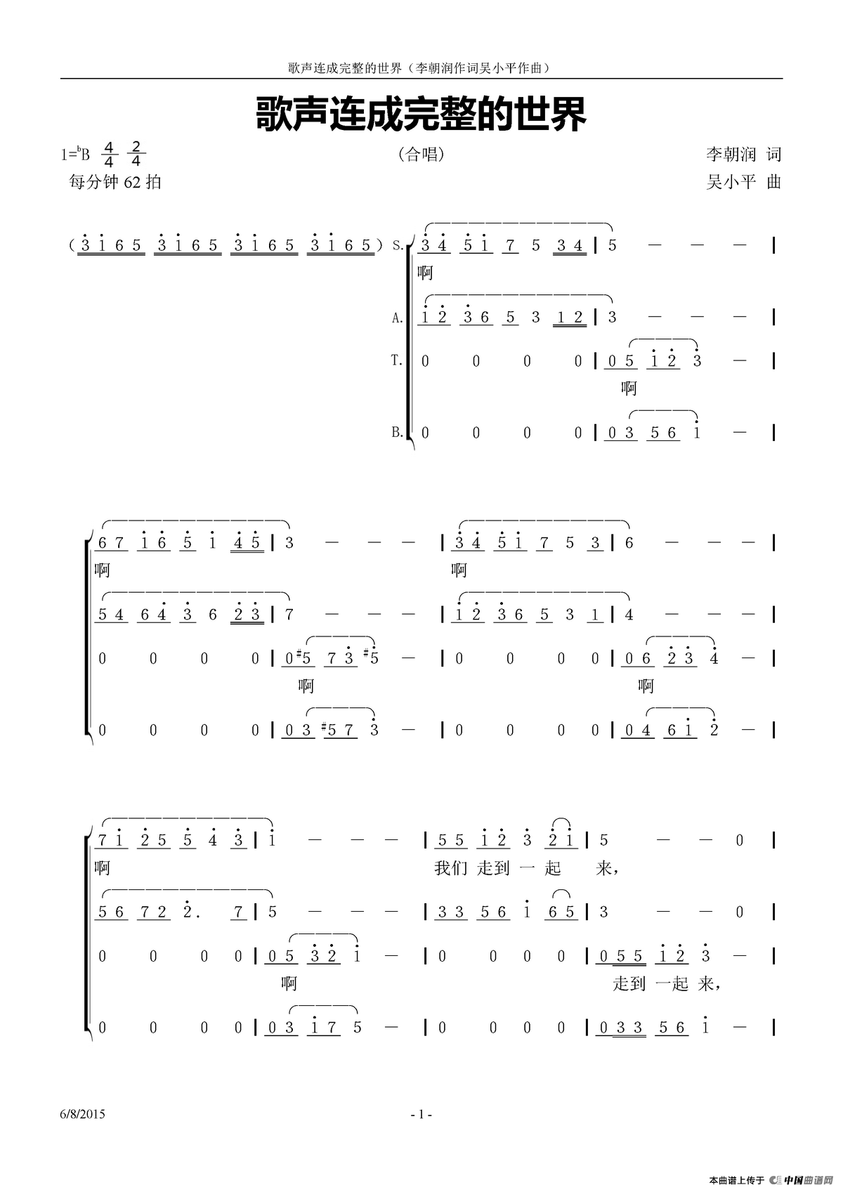 歌声连成完整的世界合唱谱该歌谱演奏者为吴小平 ,歌曲名称为歌声连成完整的世界,歌谱类型为合唱谱。集体演唱多声部声乐作品的艺术门类,常有指挥,可有伴奏或无伴奏。它要求单一声部音的高度统一,要求声部之间旋律的和谐,是普及性最强、参与面最广的音乐演出形式之一。人声作为合唱艺术的表现工具,有着其独特的优越性,能够最直接地表达音乐作品中的思想情感,激发听众的情感共鸣。声部的数量没有规定,一般有四个声部。多为男高音区,男中低音区,女高音区,女中低音区。