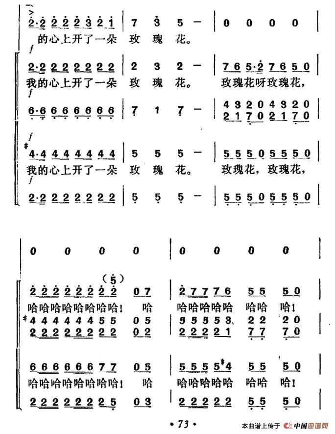 我的心上开了一朵玫瑰花合唱谱该歌谱演奏者为贺绿汀,歌曲名称为我的心上开了一朵玫瑰花,歌谱类型为合唱谱。集体演唱多声部声乐作品的艺术门类,常有指挥,可有伴奏或无伴奏。它要求单一声部音的高度统一,要求声部之间旋律的和谐,是普及性最强、参与面最广的音乐演出形式之一。人声作为合唱艺术的表现工具,有着其独特的优越性,能够最直接地表达音乐作品中的思想情感,激发听众的情感共鸣。声部的数量没有规定,一般有四个声部。多为男高音区,男中低音区,女高音区,女中低音区。