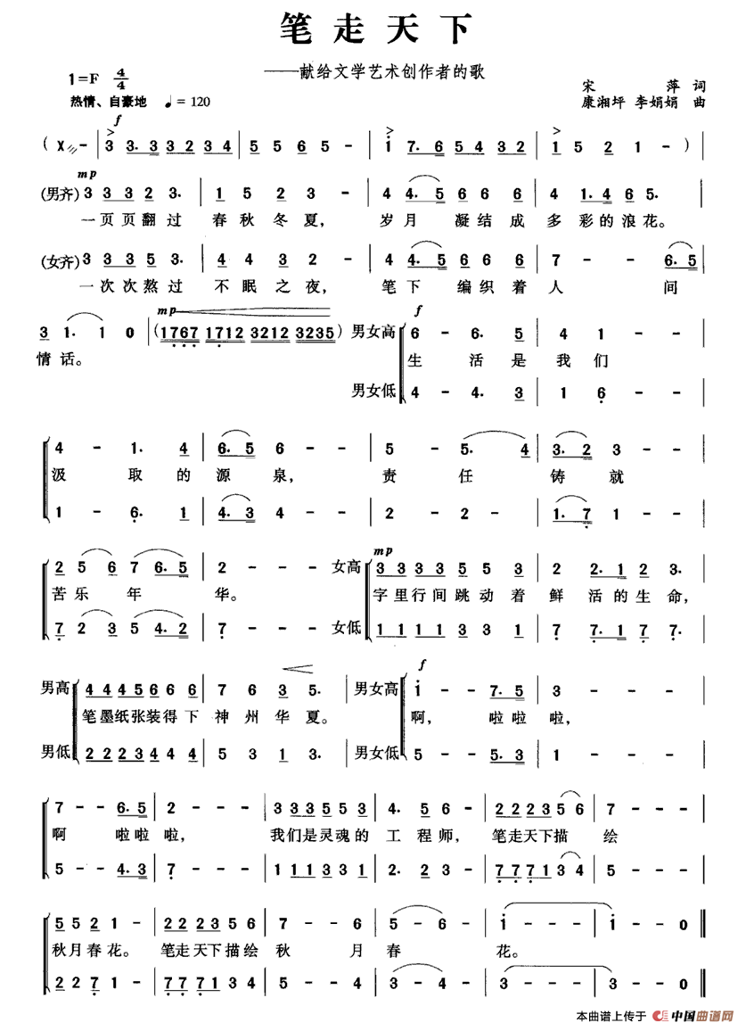 笔走天下(献给文学艺术创作者的歌)合唱谱