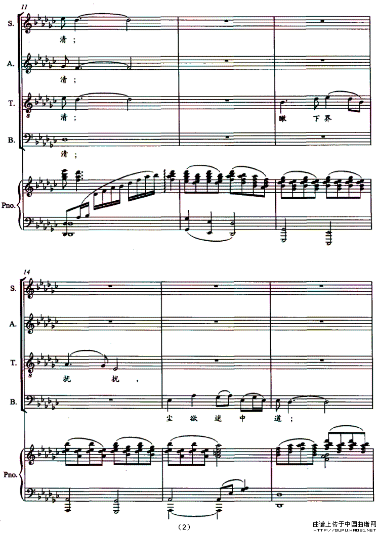 由女高音声部、女低音声部、男高音声部和男低音声部四个基本声部组成的合唱为混声合唱。每个基本声部可分为第一、第二两个分声部。