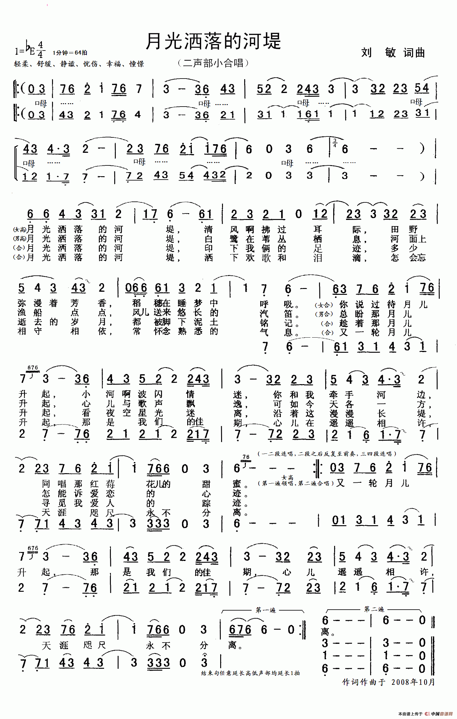 月光洒落的河堤合唱谱该歌谱演奏者为刘敏,歌曲名称为月光洒落的河堤,歌谱类型为合唱谱。合唱(hé chàng)chorus指集体演唱多声部声乐作品的艺术门类,常有指挥,可有伴奏或无伴奏。它要求单一声部音的高度统一,要求声部之间旋律的和谐,是普及性最强、参与面最广的音乐演出形式之一。人声作为合唱艺术的表现工具,有着其独特的优越性,能够最直接地表达音乐作品中的思想情感,激发听众的情感共鸣。声部的数量没有规定,一般有四个声部。多为男高音区,男中低音区,女高音区,女中低音区。
