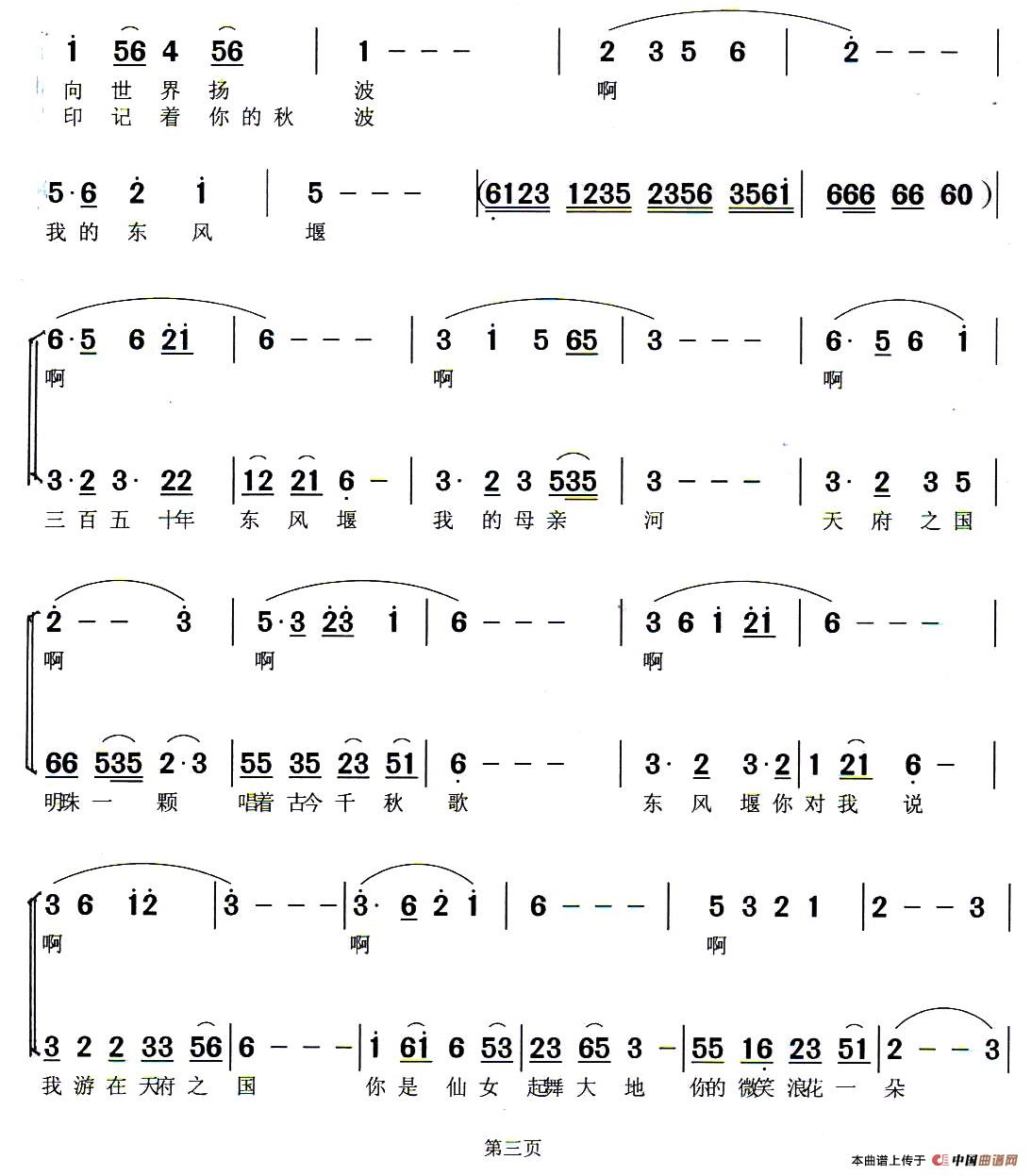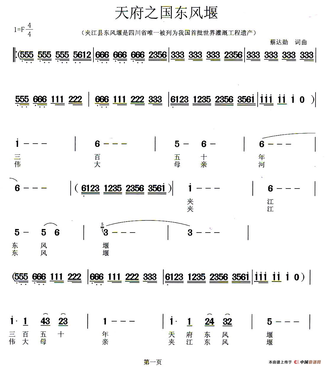 天府之国东风堰合唱谱该歌谱演奏者为蔡达勋,歌曲名称为天府之国东风堰,歌谱类型为合唱谱。集体演唱多声部声乐作品的艺术门类,常有指挥,可有伴奏或无伴奏。它要求单一声部音的高度统一,要求声部之间旋律的和谐,是普及性最强、参与面最广的音乐演出形式之一。人声作为合唱艺术的表现工具,有着其独特的优越性,能够最直接地表达音乐作品中的思想情感,激发听众的情感共鸣。声部的数量没有规定,一般有四个声部。多为男高音区,男中低音区,女高音区,女中低音区。