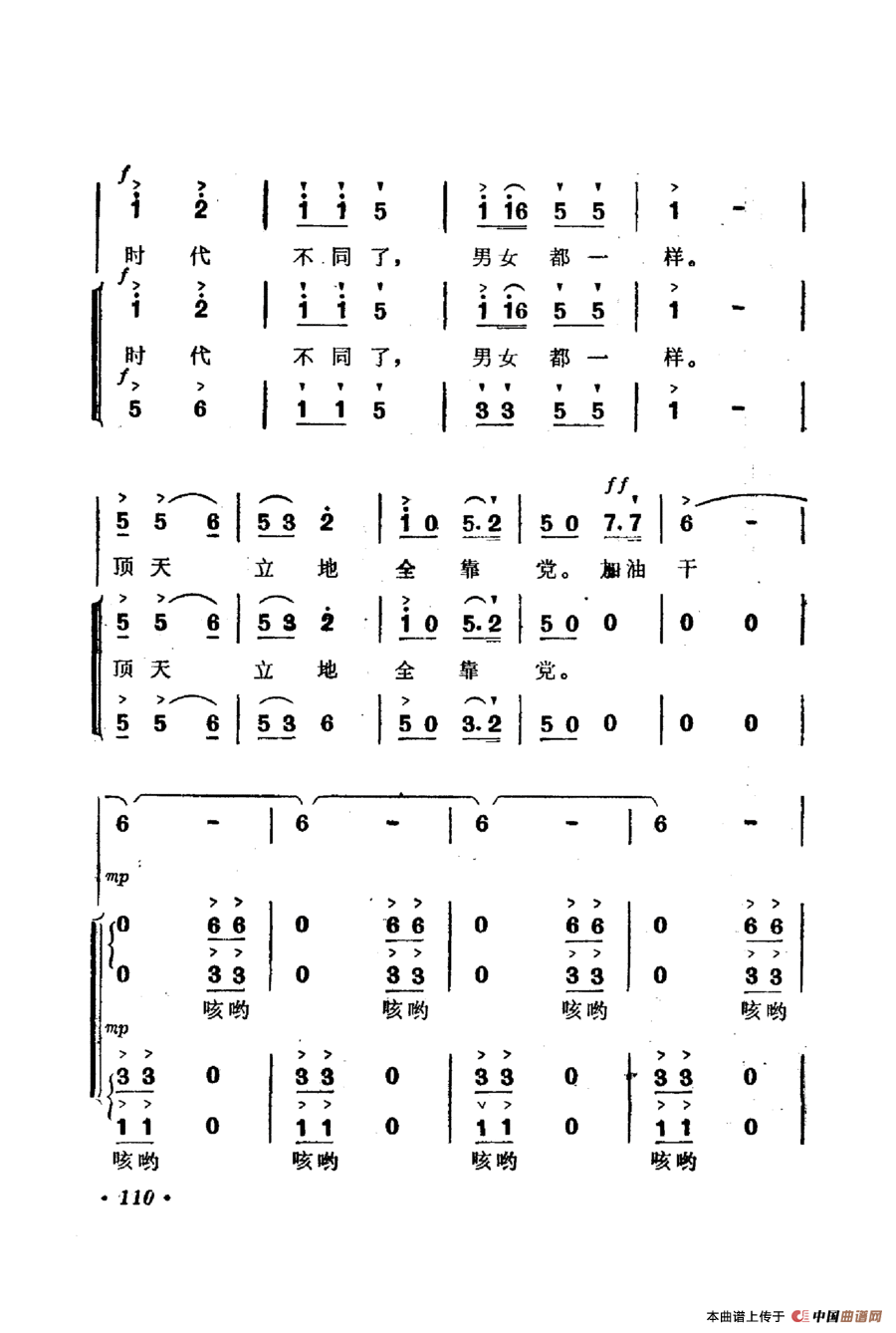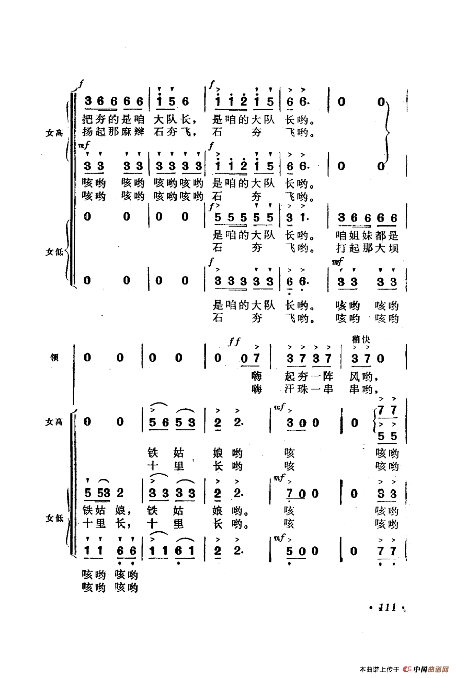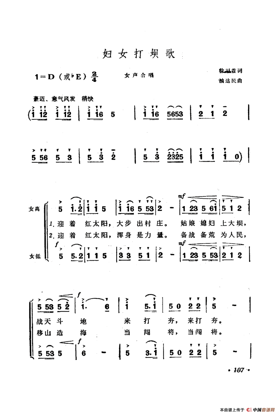 妇女打坝歌合唱谱该歌谱演奏者为合唱,歌曲名称为妇女打坝歌,歌谱类型为合唱谱。集体演唱多声部声乐作品的艺术门类,常有指挥,可有伴奏或无伴奏。它要求单一声部音的高度统一,要求声部之间旋律的和谐,是普及性最强、参与面最广的音乐演出形式之一。人声作为合唱艺术的表现工具,有着其独特的优越性,能够最直接地表达音乐作品中的思想情感,激发听众的情感共鸣。声部的数量没有规定,一般有四个声部。多为男高音区,男中低音区,女高音区,女中低音区。
