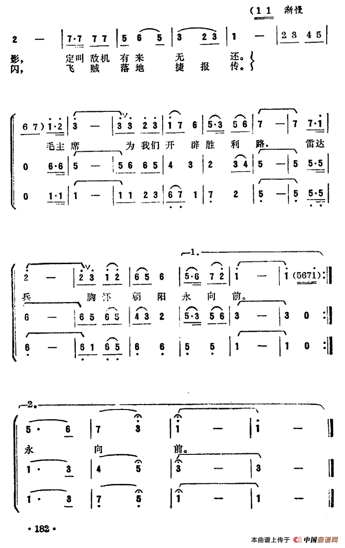 我们是祖国的千里眼合唱谱该歌谱演奏者为孟春明 ,歌曲名称为我们是祖国的千里眼,歌谱类型为合唱谱。集体演唱多声部声乐作品的艺术门类,常有指挥,可有伴奏或无伴奏。它要求单一声部音的高度统一,要求声部之间旋律的和谐,是普及性最强、参与面最广的音乐演出形式之一。人声作为合唱艺术的表现工具,有着其独特的优越性,能够最直接地表达音乐作品中的思想情感,激发听众的情感共鸣。声部的数量没有规定,一般有四个声部。多为男高音区,男中低音区,女高音区,女中低音区。