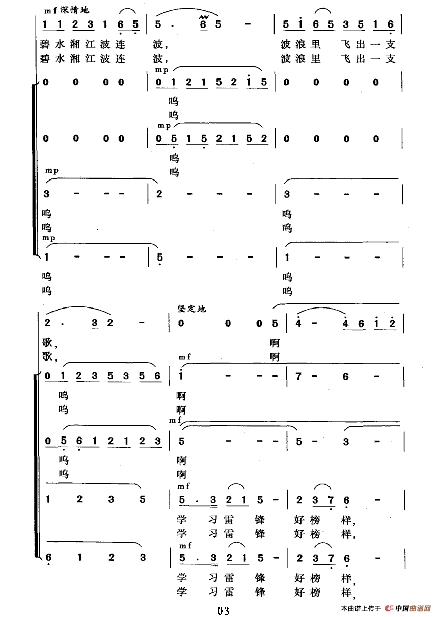 我是雷锋家乡人合唱谱该歌谱演奏者为殷景阳,歌曲名称为我是雷锋家乡人,歌谱类型为合唱谱。集体演唱多声部声乐作品的艺术门类,常有指挥,可有伴奏或无伴奏。它要求单一声部音的高度统一,要求声部之间旋律的和谐,是普及性最强、参与面最广的音乐演出形式之一。人声作为合唱艺术的表现工具,有着其独特的优越性,能够最直接地表达音乐作品中的思想情感,激发听众的情感共鸣。声部的数量没有规定,一般有四个声部。多为男高音区,男中低音区,女高音区,女中低音区。