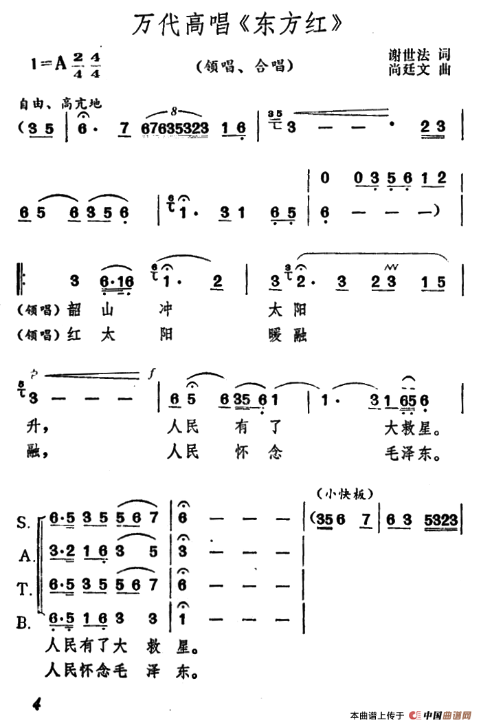 万代高唱《东方红》合唱谱该歌谱演奏者为尚廷文 ,歌曲名称为万代高唱《东方红》,歌谱类型为合唱谱。集体演唱多声部声乐作品的艺术门类,常有指挥,可有伴奏或无伴奏。它要求单一声部音的高度统一,要求声部之间旋律的和谐,是普及性最强、参与面最广的音乐演出形式之一。人声作为合唱艺术的表现工具,有着其独特的优越性,能够最直接地表达音乐作品中的思想情感,激发听众的情感共鸣。声部的数量没有规定,一般有四个声部。多为男高音区,男中低音区,女高音区,女中低音区。