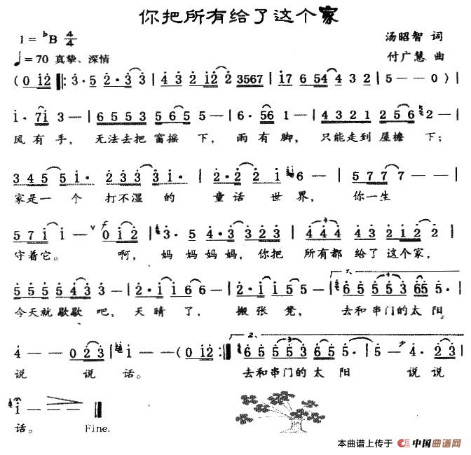 你把所有给了这个家合唱谱该歌谱演奏者为付广慧,歌曲名称为你把所有给了这个家,歌谱类型为合唱谱。集体演唱多声部声乐作品的艺术门类,常有指挥,可有伴奏或无伴奏。它要求单一声部音的高度统一,要求声部之间旋律的和谐,是普及性最强、参与面最广的音乐演出形式之一。人声作为合唱艺术的表现工具,有着其独特的优越性,能够最直接地表达音乐作品中的思想情感,激发听众的情感共鸣。声部的数量没有规定,一般有四个声部。多为男高音区,男中低音区,女高音区,女中低音区。