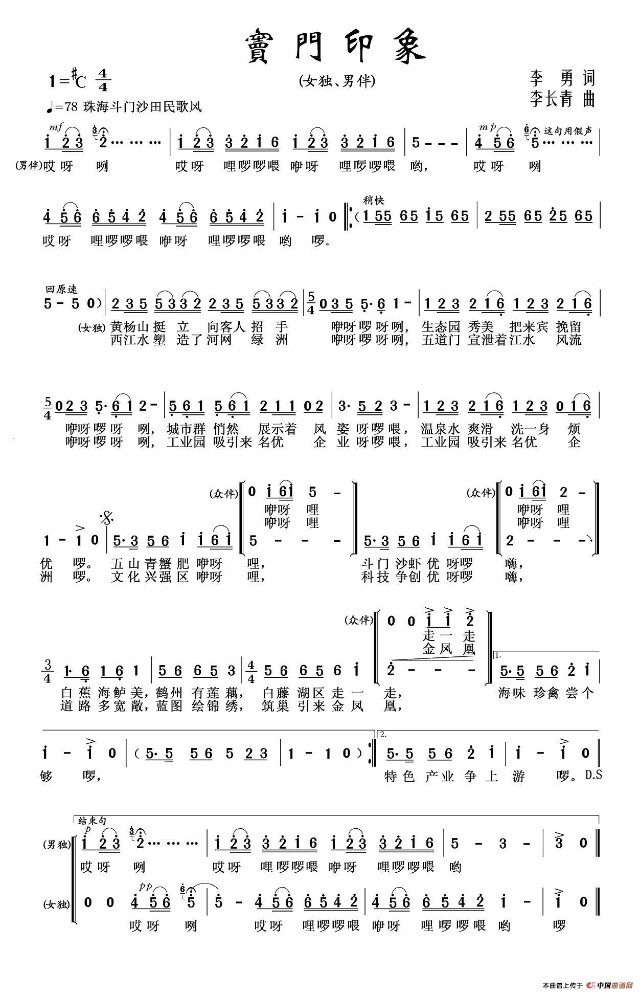 斗门印象合唱谱该歌谱演奏者为李长青,歌曲名称为斗门印象,歌谱类型为合唱谱。集体演唱多声部声乐作品的艺术门类,常有指挥,可有伴奏或无伴奏。它要求单一声部音的高度统一,要求声部之间旋律的和谐,是普及性最强、参与面最广的音乐演出形式之一。人声作为合唱艺术的表现工具,有着其独特的优越性,能够最直接地表达音乐作品中的思想情感,激发听众的情感共鸣。声部的数量没有规定,一般有四个声部。多为男高音区,男中低音区,女高音区,女中低音区。