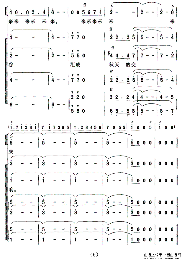 由女高音声部、女低音声部、男高音声部和男低音声部四个基本声部组成的合唱为混声合唱。每个基本声部可分为第一、第二两个分声部。