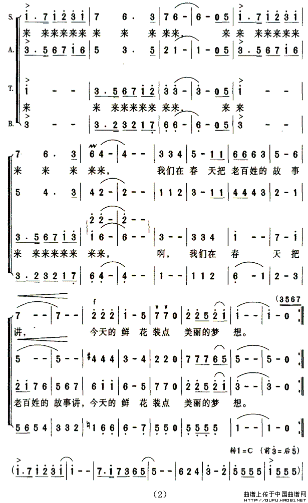 乘上春天的翅膀合唱谱该歌谱演奏者为合唱,歌曲名称为乘上春天的翅膀,歌谱类型为合唱谱。指集体演唱多声部声乐作品的艺术门类,常有指挥,可有伴奏或无伴奏。它要求单一声部音的高度统一,要求声部之间旋律的和谐,是普及性最强、参与面最广的音乐演出形式之一。人声作为合唱艺术的表现工具,有着其独特的优越性,能够最直接地表达音乐作品中的思想情感,激发听众的情感共鸣。声部的数量没有规定,一般有四个声部。多为男高音区,男中低音区,女高音区,女中低音区。