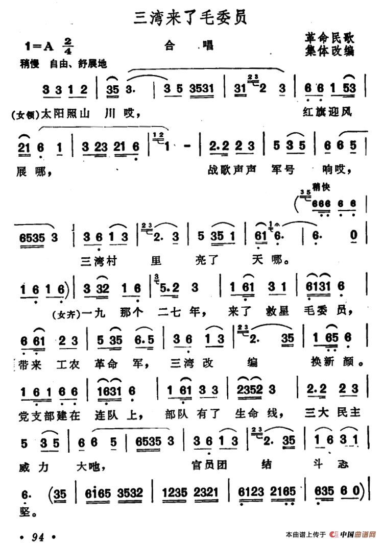 三湾来了毛委员合唱谱该歌谱演奏者为革命民歌,歌曲名称为三湾来了毛委员,歌谱类型为合唱谱。合唱(hé chàng)chorus指集体演唱多声部声乐作品的艺术门类,常有指挥,可有伴奏或无伴奏。它要求单一声部音的高度统一,要求声部之间旋律的和谐,是普及性最强、参与面最广的音乐演出形式之一。人声作为合唱艺术的表现工具,有着其独特的优越性,能够最直接地表达音乐作品中的思想情感,激发听众的情感共鸣。声部的数量没有规定,一般有四个声部。多为男高音区,男中低音区,女高音区,女中低音区。