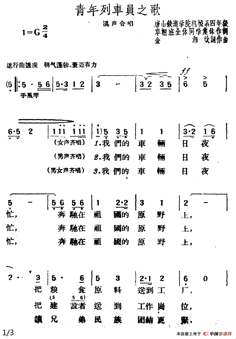 青年列车员之歌合唱谱该歌谱演奏者为金湘,歌曲名称为青年列车员之歌,歌谱类型为合唱谱。集体演唱多声部声乐作品的艺术门类,常有指挥,可有伴奏或无伴奏。它要求单一声部音的高度统一,要求声部之间旋律的和谐,是普及性最强、参与面最广的音乐演出形式之一。人声作为合唱艺术的表现工具,有着其独特的优越性,能够最直接地表达音乐作品中的思想情感,激发听众的情感共鸣。声部的数量没有规定,一般有四个声部。多为男高音区,男中低音区,女高音区,女中低音区。