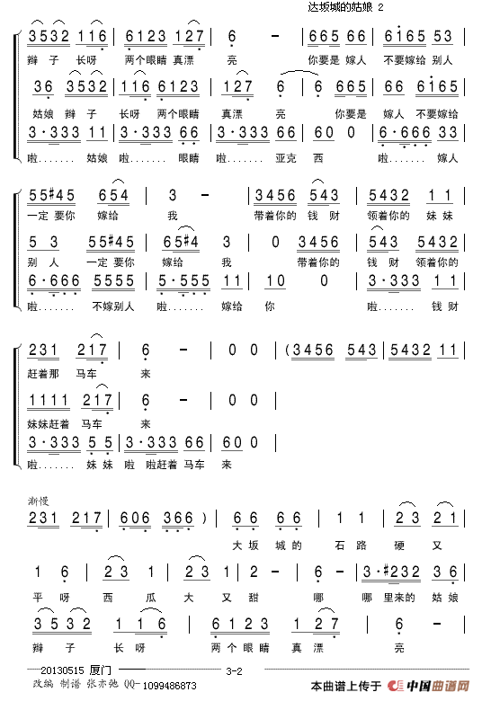 达坂城的姑娘(三部合唱)合唱谱该歌谱演奏者为王洛宾,歌曲名称为达坂城的姑娘,歌谱类型为合唱谱。《达坂城的姑娘》是王洛宾在兰州整理编曲的第一首维吾尔族民歌。也是现代中国第一首汉语译配的维吾尔民歌。1938年,王洛宾所在的抗战剧团组织联欢会,一个头戴小花帽,留着小胡子的维吾尔族司机,唱了一首简短的维吾尔语歌曲。王洛宾敏锐的音乐神经被触动了,他用在学校学习的速记方法很快记下了这支歌的旋律,并请在兰州的维吾尔族商贩对歌词作了简单的翻译。他很快就编配成一首简短流畅的《达坂城的姑娘》。达坂城的姑娘很漂亮。
