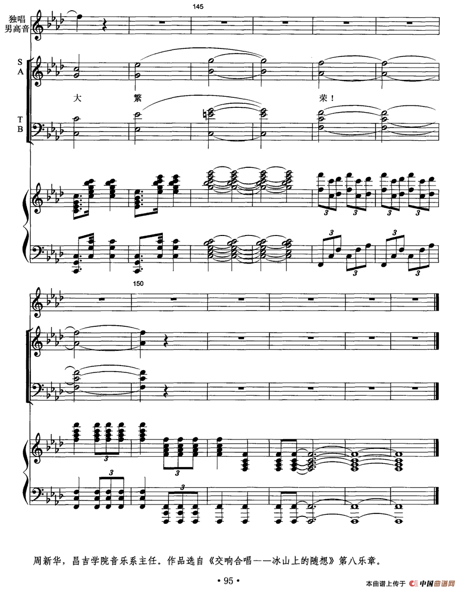 终曲·冰山上的随想(男高音+交响合唱、正谱)合唱谱该歌谱演奏者为周新华,歌曲名称为终曲·冰山上的随想,歌谱类型为合唱谱。选自交响合唱《冰山上的随想》第八乐章