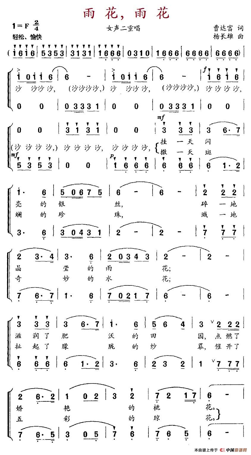 雨花,雨花合唱谱该歌谱演奏者为杨长雄,歌曲名称为雨花,雨花,歌谱类型为合唱谱。指集体演唱多声部声乐作品的艺术门类,常有指挥,可有伴奏或无伴奏。它要求单一声部音的高度统一,要求声部之间旋律的和谐,是普及性最强、参与面最广的音乐演出形式之一。人声作为合唱艺术的表现工具,有着其独特的优越性,能够最直接地表达音乐作品中的思想情感,激发听众的情感共鸣。声部的数量没有规定,一般有四个声部。多为男高音区,男中低音区,女高音区,女中低音区。