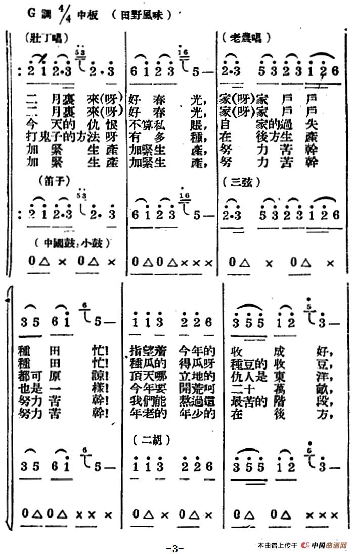 生产大合唱(二幕活报型歌剧)合唱谱该歌谱演奏者为冼星海 ,歌曲名称为生产大合唱,歌谱类型为合唱谱。 1938年12月9日,延安青年界集会纪念“一二“九”运动。毛泽东在讲话中第一次提出了大生产运动。散会后,毛泽东、塞克、李昌三人同桌吃饭。席间,毛译东又说起了大生产间题,并希望塞克以笔耕来促进大生产运动。 恰巧此时冼星海向塞克求词,他说。‘塞克,你写个厉害的!”塞克开始思考冼星海的话,什么是“厉害”的呢?冲啊、杀呀,已经不少了。转眼到了1939年春天。有一天,塞克在延河边散步。延安热火朝天的大生产运动,使他深受感动,并产生了创作欲望。他想,这不是厉害的吗?大生产运动,对抗亘战争产生了伟大的影响,将来在厉史上也会记上一页。这个题材可以搞一个大型的、新顺的、有气魄的作品,也就是星海说的“厉害”的。予是,他在延河边上就构思起来。 经过反复的思索,塞克觉得腹稿成熟了,用了整整一天的时间,写出了《生产运动大合唱》的歌词。 冼星海很欣赏这部大合唱词,立即动笔,只用了六天的时间,就谱写出了总谱。1939年3月21日,鲁艺在陕北公学预演《生产大合唱》,获得了成功。此后,这个大合唱响遍了全国。