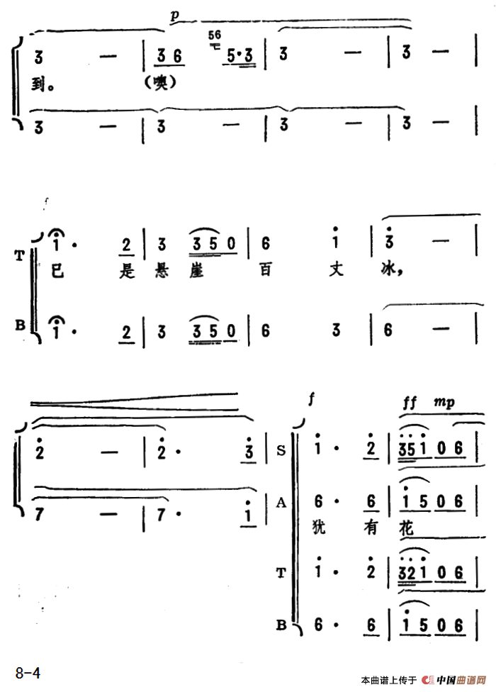 咏梅·卜算子(毛泽东词 劫夫曲)合唱谱该歌谱演奏者为劫夫,歌曲名称为咏梅·卜算子,歌谱类型为合唱谱。指集体演唱多声部声乐作品的艺术门类,常有指挥,可有伴奏或无伴奏。它要求单一声部音的高度统一,要求声部之间旋律的和谐,是普及性最强、参与面最广的音乐演出形式之一。人声作为合唱艺术的表现工具,有着其独特的优越性,能够最直接地表达音乐作品中的思想情感,激发听众的情感共鸣。声部的数量没有规定,一般有四个声部。多为男高音区,男中低音区,女高音区,女中低音区。