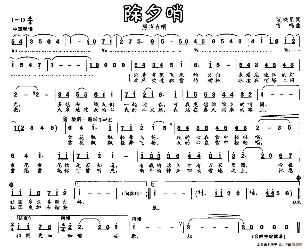 除夕哨合唱谱中速稍慢版该歌谱演奏者为方鸣,歌曲名称为除夕哨,歌谱类型为合唱谱。集体演唱多声部声乐作品的艺术门类,常有指挥,可有伴奏或无伴奏。它要求单一声部音的高度统一,要求声部之间旋律的和谐,是普及性最强、参与面最广的音乐演出形式之一。人声作为合唱艺术的表现工具,有着其独特的优越性,能够最直接地表达音乐作品中的思想情感,激发听众的情感共鸣。声部的数量没有规定,一般有四个声部。多为男高音区,男中低音区,女高音区,女中低音区。